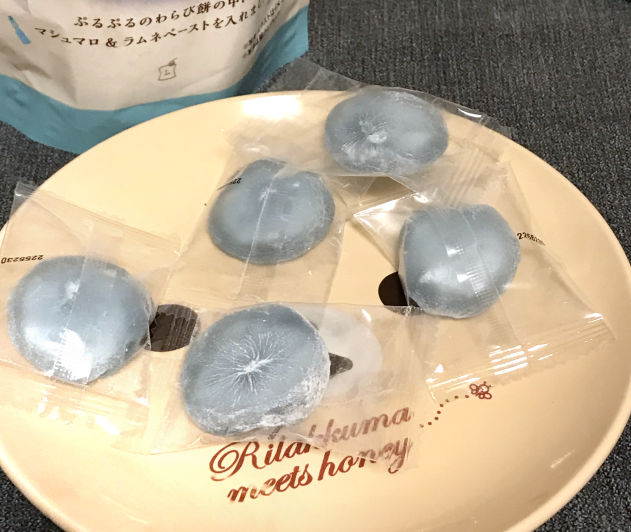パッケージに書いてある通り、わらび餅の中にマシュマロとラムネペーストが入っています。